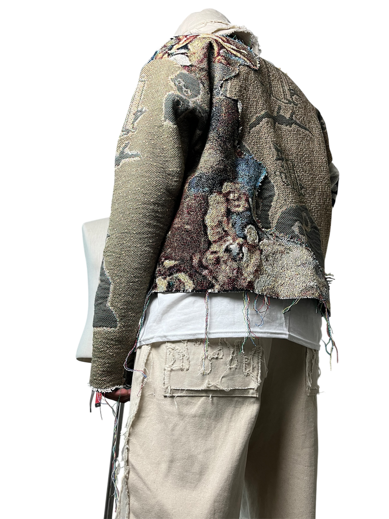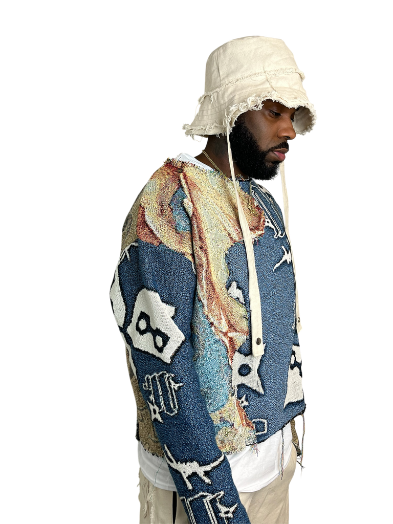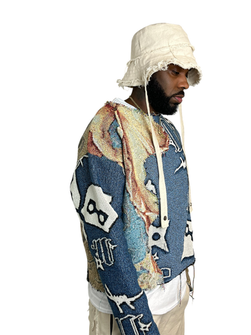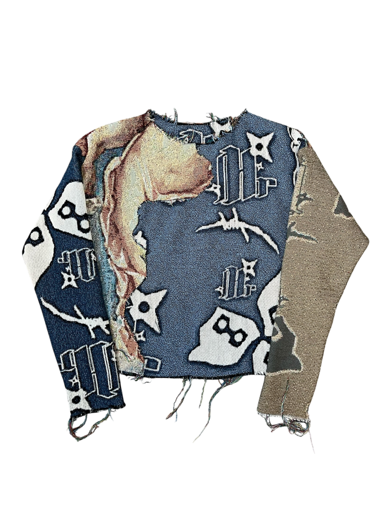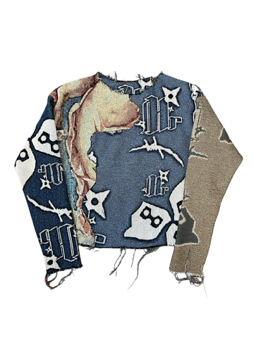 LORE: This piece was born for the need of a distressed oversized sweatshirt at a fashion show. Constructed from the remnants of several previous projects requiring the same custom print woven fabrication. This piece carries the weight of the ambitious projects that came before to produce an incredible take on distress.